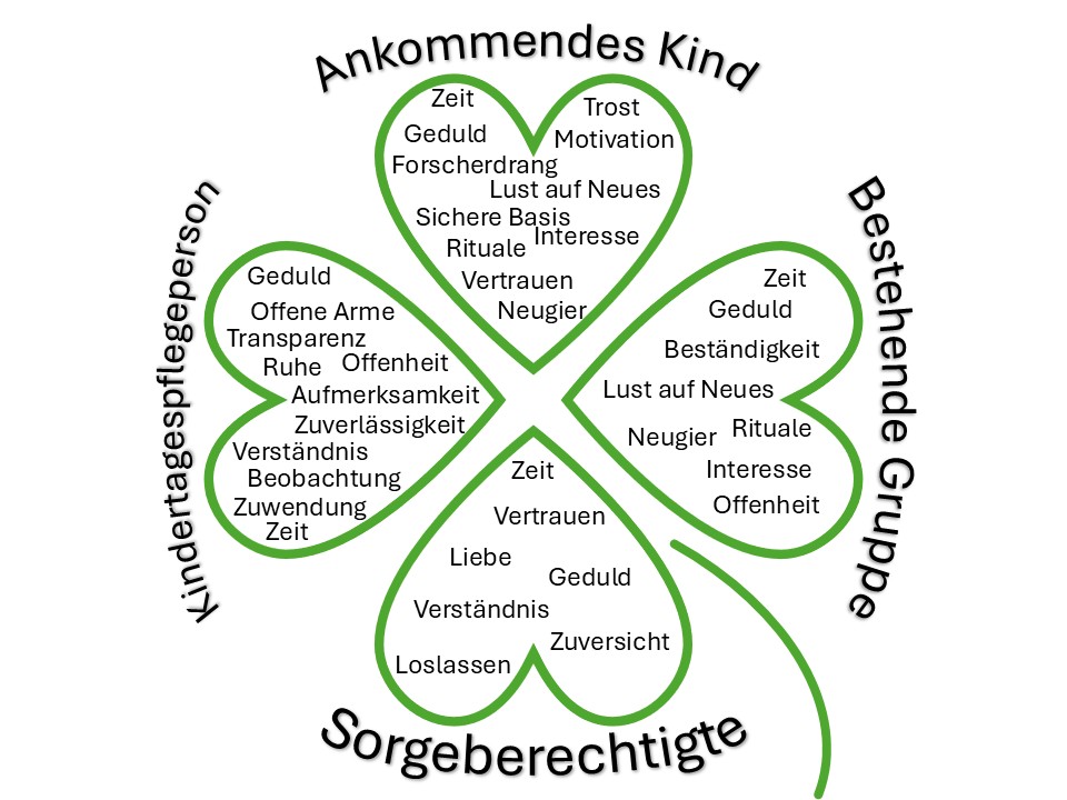 Um all diesen „vier Blättern eines Kleeblatts“ eine möglichst stressreduzierte Ankommenszeit zu ermöglichen, ist der bedürfnisorientierte Ansatz darauf angelegt, nicht nur auf das ankommende Kind, sondern eben auch auf alle anderen Beteiligten zu schauen.